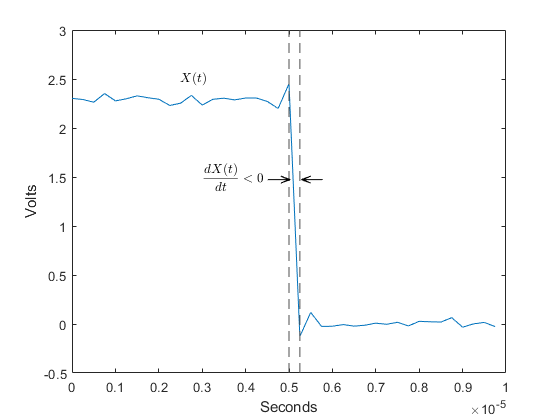 возвращает вектор f = falltime(x)f содержит время каждого перехода двухуровневой формы сигнала x переходит от 10% опорного уровня к 90% опорному уровню (см. раздел Процент опорных уровней). Чтобы определить переходы, falltime оценивает уровни состояния входной формы сигнала с использованием метода гистограммы. falltime идентифицирует все области, которые пересекают границу нижнего состояния высокого состояния и границу верхнего состояния низкого состояния. Границы низкого состояния и высокого состояния выражаются как уровень состояния плюс или минус кратный разнице между уровнями состояния (см. «Допуски уровня состояния»). Поскольку falltime использует интерполяцию, f может содержать значения, которые не соответствуют моментам дискретизации двухуровневого сигнала x.
