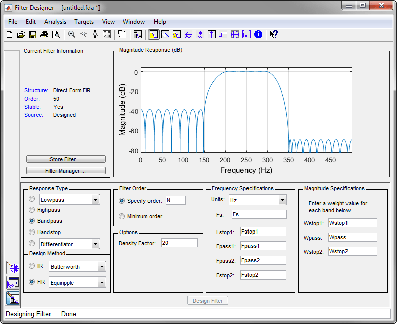 Wstop1 = 3; Wpass = 1; Wstop2 = 100; filterDesigner