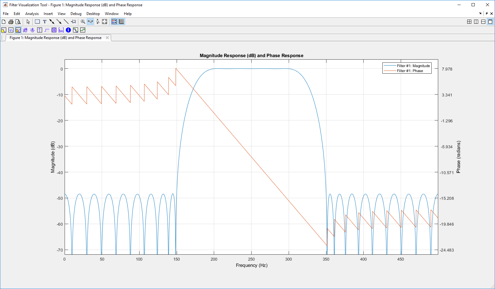 N = 50; Fstop1 = 150; Fstop2 = 350; Fpass1 = 200; Fpass2 = 300; Fs = 1e3; bpFilt = designfilt('bandpassfir','FilterOrder',N, ... 'StopbandFrequency1',Fstop1,... 'StopbandFrequency2',Fstop2,... 'PassbandFrequency1',Fpass1,... 'PassbandFrequency2',Fpass2,... 'SampleRate',Fs); fvtool(bpFilt,'Analysis','freq')