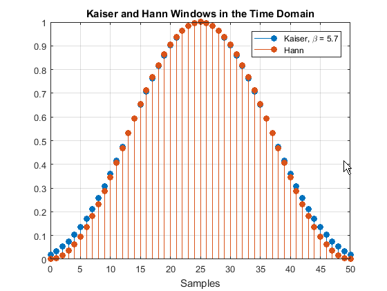| 51-точечное окно Ханна и 51-точечное окно Кайзера с β = 5,7 во временной области | 51-точечное окно Ханна и 51-точечное окно Кайзера с β = 5,7 в частотной области |