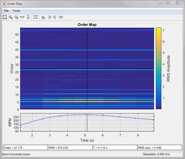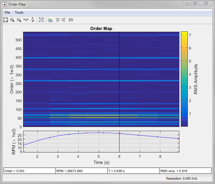 rpmordermap(___) без выходных аргументов строит карту порядка как функцию скорости вращения и времени на интерактивном рисунке.