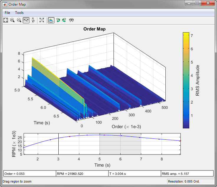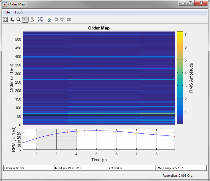 возвращает матрицу отображения order-RPM, map = rpmordermap(x,fs,rpm)map, что является результатом выполнения анализа порядка для входного вектора, x. x измеряется в наборе rpm скоростей вращения, выраженных в оборотах в минуту. fs - частота дискретизации измерения в Гц. Каждый столбец map содержит среднеквадратичные (среднеквадратичные) оценки амплитуды порядков, присутствующих в каждом rpm значение. rpmordermap передискретизирует x к постоянной скорости выборки за цикл и использует кратковременное преобразование Фурье для анализа спектрального содержания повторно дискретизированного сигнала.
