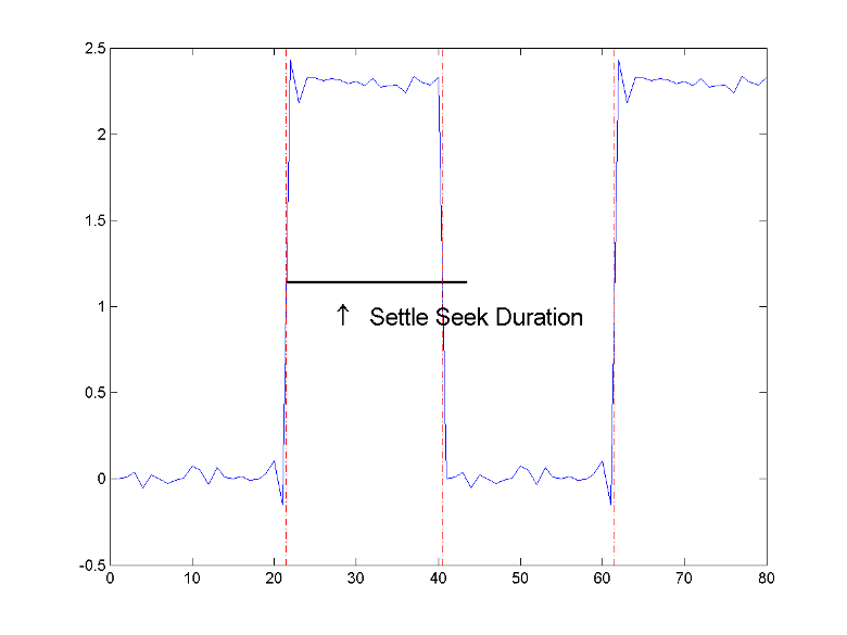 возвращает время, S = settlingtime(X,D)S, от момента среднего опорного уровня до момента времени, когда каждый переход входит и остается в пределах 2% области допуска конечного состояния в течение длительности, D. D является положительным скаляром. Поскольку settlingtime использует интерполяцию для определения момента среднего опорного уровня, S может содержать значения, которые не соответствуют моментам выборки. Длина S равно количеству обнаруженных переходов во входном сигнале, X. Если для какого-либо перехода уровень формы сигнала не остается в пределах нижней и верхней границ допуска, запрашиваемая продолжительность отсутствует или обнаруживается промежуточный переход, settlingtime отмечает соответствующий элемент в S как NaN. См. раздел Определение продолжительности поиска для случаев, в которых settlingtime возвращает NaN. Чтобы определить переходы, settlingtime оценивает уровни состояния входного сигнала методом гистограммы. settlingtime идентифицирует все области, которые пересекают границу верхнего состояния нижнего состояния и границу нижнего состояния верхнего состояния. Границы низкого состояния и высокого состояния выражаются как уровень состояния плюс или минус кратный разнице между уровнями состояния. См. раздел Допуски на уровне состояния.