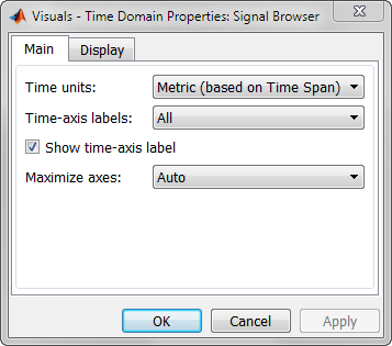 Единицы времени - единицы, используемые для описания оси времени. Обозреватель сигналов устанавливает единицы времени, используя значение параметра «Единицы времени» на вкладке «Главная» диалогового окна «Визуальные эффекты: Параметры временной области». По умолчанию для этого параметра установлено значение Metric (based on Time Span) и отображается в метрических единицах, таких как микросекунды, миллисекунды, минуты, дни и т.д. Можно изменить единицу измерения на Seconds всегда отображать значения временной оси в секундах. Вы можете изменить его на None для подавления отображения единиц измерения на оси времени. При установке для этого параметра значения None, то Signal Browser показывает только слово Time на оси времени.