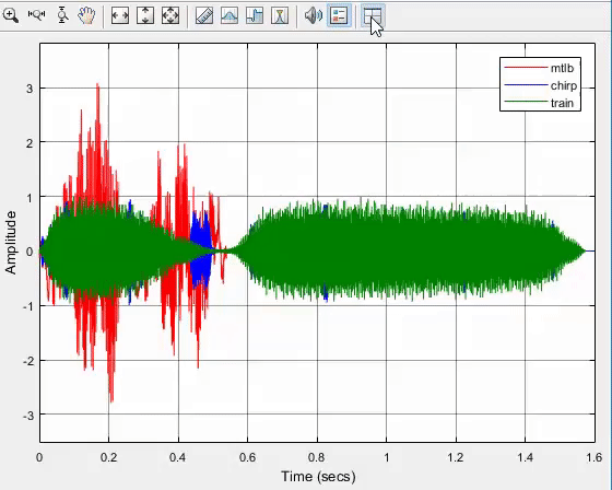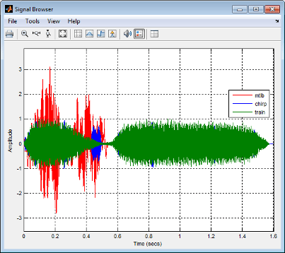 Выберите несколько сигналов в списке Сигналы (Signals) для отображения нескольких сигналов на одном и том же дисплее или на отдельных дисплеях. По умолчанию сигналы отображаются на одном и том же дисплее в виде разноцветных линий. Сигналы могут иметь различные размеры, частоты дискретизации и типы данных. Каждый сигнал может быть либо вещественным, либо комплексным.