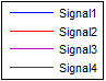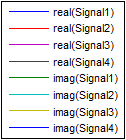 Если все входные сигналы являются вещественными, обозреватель сигналов пропускает цвета линий, которые будут связаны с их воображаемыми компонентами. Например, если выбрать 4 действительных входных сигнала, на экране появится следующая легенда.