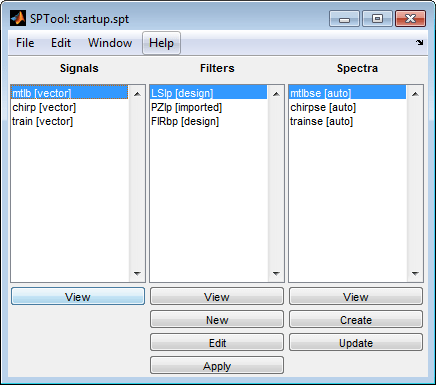 Команда, sptool, открывает SPTool, набор из четырех инструментов: Signal Browser, Filter Design and Analysis Tool, FVTool и Spectrum Viewer. Эти инструменты обеспечивают доступ ко многим функциям сигнала, фильтра и спектрального анализа на панели инструментов. При вводе sptool в командной строке открывается пакет SPTool.