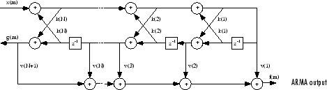 Для дискретного всеполюсного или нулевого фильтра N-го порядка, описанного полиномиальными коэффициентами a (n), n = 1 , 2 ,..., N + 1, существует N соответствующих коэффициентов структуры решетки k (n) , n = 1, 2,.. ., N. Параметры k (n) также называются коэффициентами отражения фильтра. Учитывая эти коэффициенты отражения, можно реализовать дискретный фильтр, как показано ниже.