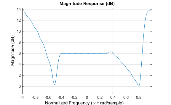Как и с firpm, вектор ребер полосы передается в cfirpm. Этот вектор определяет полосы частот, в которых выполняется оптимизация; Следует отметить, что существуют две переходные полосы, от -0,5 до -0,4 и от 0,3 до 0,4.