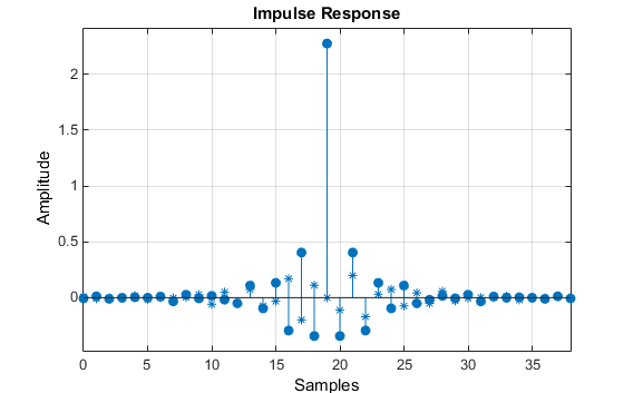 Отклик фильтра для этого многополосного фильтра является сложным, что ожидается из-за асимметрии в частотной области. Импульсная характеристика, которую можно выбрать на панели инструментов FVTool, показана ниже.
