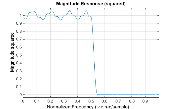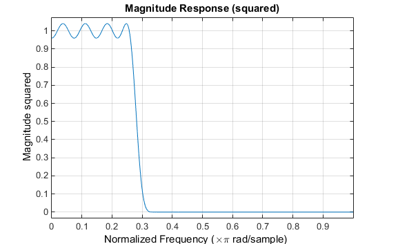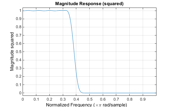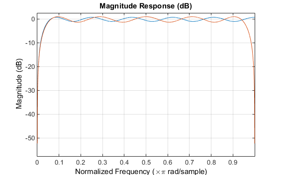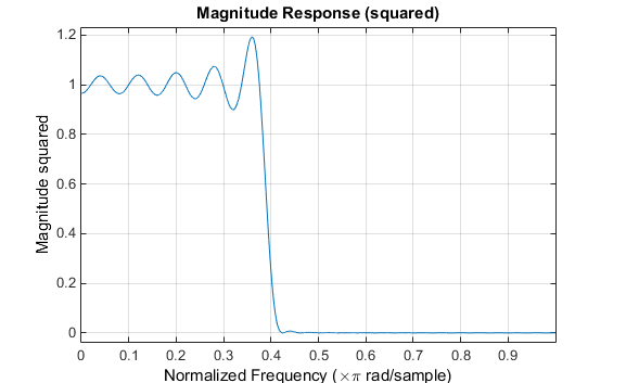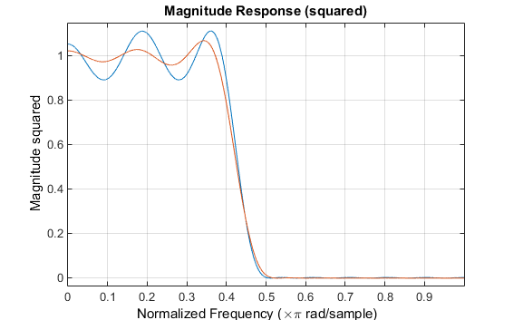 Фильтр разработан с firpm проявляет чёткое поведение. Также обратите внимание, что firls фильтр имеет лучший отклик по большей части полосы пропускания и полосы останова, но на краях полосы (f = 0.4 и f = 0.5), ответ дальше от идеала, чем firpm фильтр. Это показывает, что firpm максимальная ошибка фильтра над полосой пропускания и полосой останова меньше, и фактически она является наименьшей возможной для этой конфигурации края полосы частот и длины фильтра.