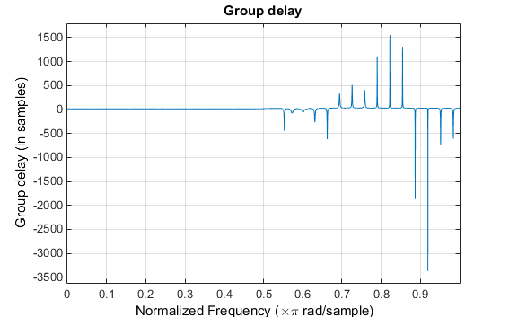 Если сравнить этот нелинейно-фазовый фильтр с линейно-фазовым фильтром, который имеет точно 14,5 выборки групповой задержки, результирующий фильтр будет порядка 2 * 14,5, или 29. Используяb = cfirpm(29,[0 0.5 0.55 1],'lowpass'), полоса пропускания и пульсация полосы останова намного больше для фильтра порядка 29. Эти сравнения помогут определить, какой фильтр более подходит для конкретного приложения.