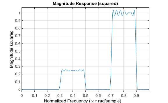 f = [0 0.3 0.4 0.7 0.8 1]; % Band edges in pairs a = [0 0 1 1 0 0]; % Bandpass filter amplitude