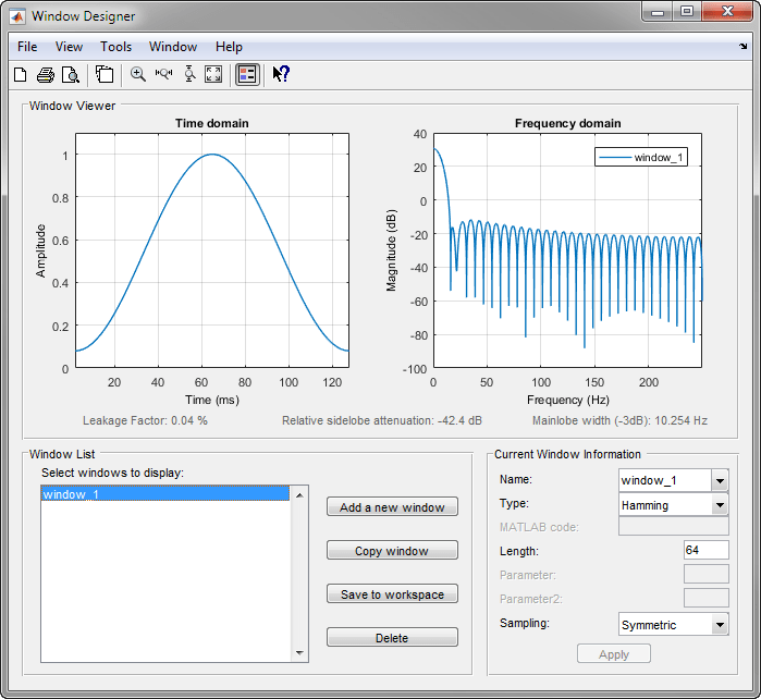 Добавить новое окно - добавляет окно Хэмминга по умолчанию с длиной 64 и симметричной выборкой. Можно изменить информацию для этого окна, применив изменения, внесенные на панели «Информация о текущем окне».