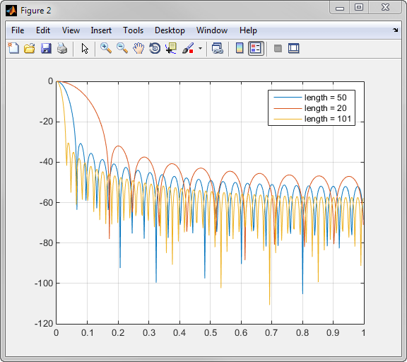 w1 = kaiser(50,4); w2 = kaiser(20,4); w3 = kaiser(101,4); [W1,f] = freqz(w1/sum(w1),1,512,2); [W2,f] = freqz(w2/sum(w2),1,512,2); [W3,f] = freqz(w3/sum(w3),1,512,2); plot(f,20*log10(abs([W1 W2 W3]))) grid legend('length = 50','length = 20','length = 101')
