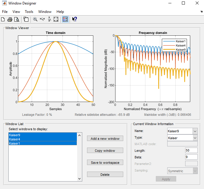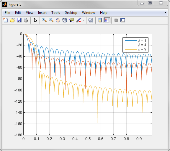 n = 50; w1 = kaiser(n,1); w2 = kaiser(n,4); w3 = kaiser(n,9); [W1,f] = freqz(w1/sum(w1),1,512,2); [W2,f] = freqz(w2/sum(w2),1,512,2); [W3,f] = freqz(w3/sum(w3),1,512,2); plot(f,20*log10(abs([W1 W2 W3]))) grid legend('\beta = 1','\beta = 4','\beta = 9')
