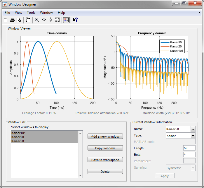 Чтобы создать эти окна Kaiser с помощью командной строки MATLAB ®, введите следующее:
