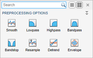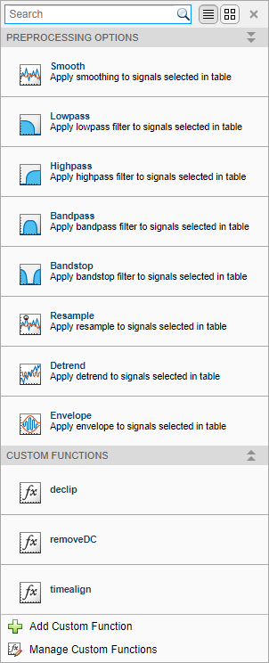 Если функция предварительной обработки уже записана, и она находится в текущей папке или в пути MATLAB, приложение включает ее в галерею. Для поиска имени функции можно использовать заполнение вкладки.