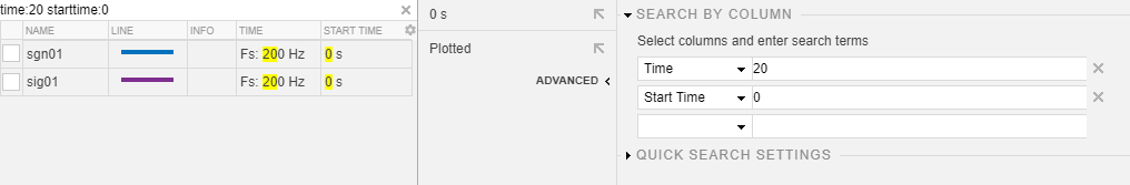 При выборе Time и введите 20приложение находит четыре сигнала, дискретизированные на частоте 200 Гц. Если также выбрать Start Time во втором текстовом поле и введите 0, приложение находит sgn01 и sig01.