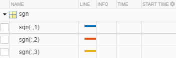 Пример: Матрица 100 на 3 называется sgn появляется в таблице Сигнал как sgn. При развертывании дерева можно увидеть три отдельных столбца с меткой sgn(:,1), sgn(:,2), и sgn(:,3).