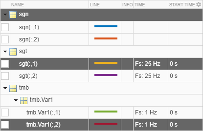 Пример: Создайте три двухканальных сигнала. Каждый канал sgn имеет 100 образцов. Каждый канал sgt имеет 200 образцов. Расписание tmb содержит два канала с 20 выборками, дискретизированные на частоте 1 Гц.