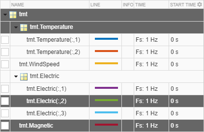 sgt_1 как вектор, даже если у него есть информация о времени. На вкладке Анализатор (Analyzer) щелкните Настройки (Preferences) и проверьте Always use timetables when signals have time information. Снова экспортируйте сигналы. sgt_1 становится расписанием.Пример: Создайте расписание с четырьмя переменными. "Temperature" имеет два канала, "WindSpeed" имеет один канал, "Electric" имеет три канала, и "Magnetic" имеет один канал.