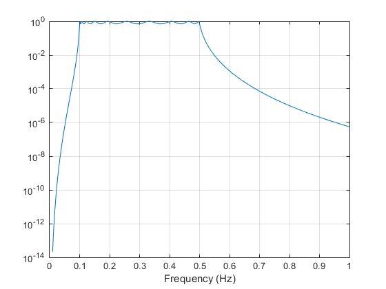 Нижний край полосы находится на частоте 0,1 Гц, как и ожидалось. Заметим, однако, что верхний край полосы немного меньше 0,5 Гц, хотя в аналоговой области он был ровно 0,5 Гц. Это иллюстрирует нелинейный характер билинейного преобразования. Чтобы противодействовать этой нелинейности, необходимо создать аналоговые доменные фильтры с «предварительно предупрежденными» краями полосы, которые отображаются в правильные местоположения при билинейном преобразовании. Здесь предварительно предупрежденные частоты u1 и u2 произвести Bw и Wo для lp2bp функция: