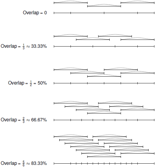 Рассмотрим сигнал из семи выборок [s0 s1 s2 s3 s4 s5 s6]. Поскольку ⌈ 7/2 ⌉ = ⌈ 3,5 ⌉ = 4, приложение делит сигнал на два сегмента длиной четыре, когда нет перекрытия. Количество сегментов изменяется по мере увеличения перекрытия.