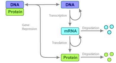 DNA -> DNA + mRNA (transcription) mRNA -> mRNA + protein (translation) DNA + protein -> DNAProteinComplex (binding) DNAProteinComplex -> DNA + protein (unbinding) mRNA -> null (degradation) protein -> null (degradation)