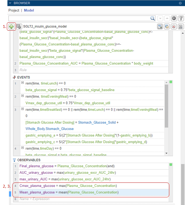 SimBiology позволяет выполнять вычисления постсимуляции путем определения и оценки пользовательских выражений. Такое выражение называется Observable. На следующих шагах в модель добавляются наблюдаемые выражения для вычисления Cmax и средних значений профиля концентрация-время глюкозы в плазме.