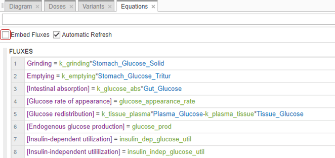 По умолчанию приложение встраивает потоки реакций, когда они отображаются в уравнениях модели. Снимите флажок «Встроить потоки», чтобы увидеть раздел «Потоки» отдельно.