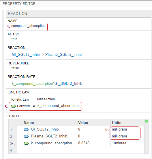 В разделе Kinetic Law измените автоматически созданный параметр Forward rate kf на k_compound_absorption. Модель уже имеет параметр форвардной скорости k_compound_absorption который был создан ранее. Приложение использует зеленый текст для имен параметров и синий текст для имен видов в выражении скорости реакции.