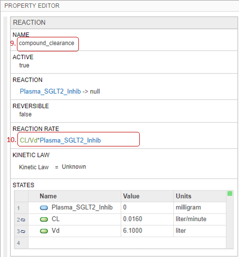 На панели «Редактор свойств» обновите строку «Реакция» до Plasma_Glucose + Plasma_SGLT2_Inhib -> Plasma_SGLT2_Inhib + Urinary_Glucose_Excr_AUC. Теперь подключается пунктирная линия Plasma_SGLT2_Inhib к блоку реакции на вкладке «Схема».