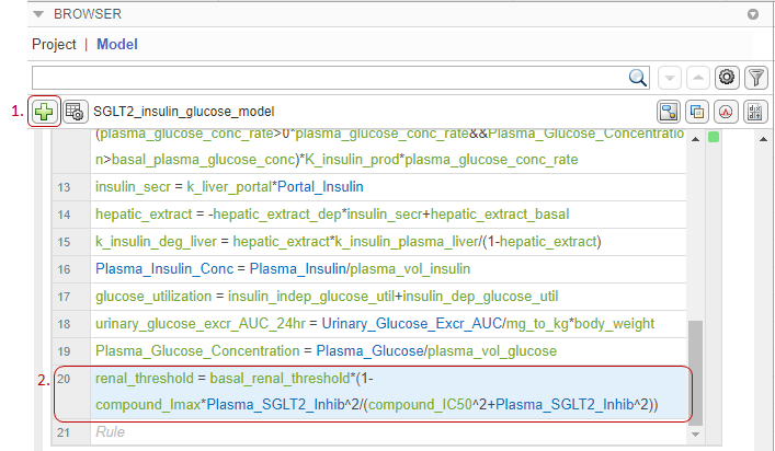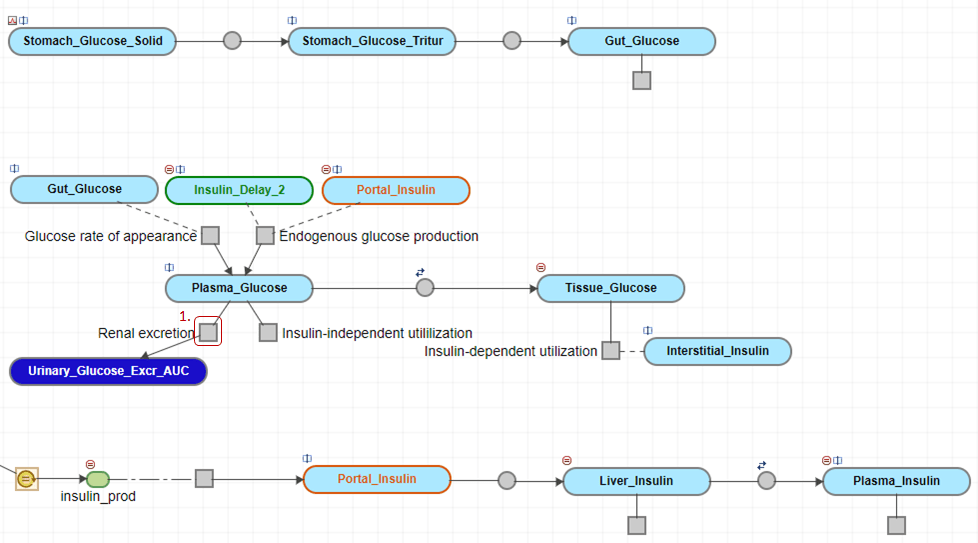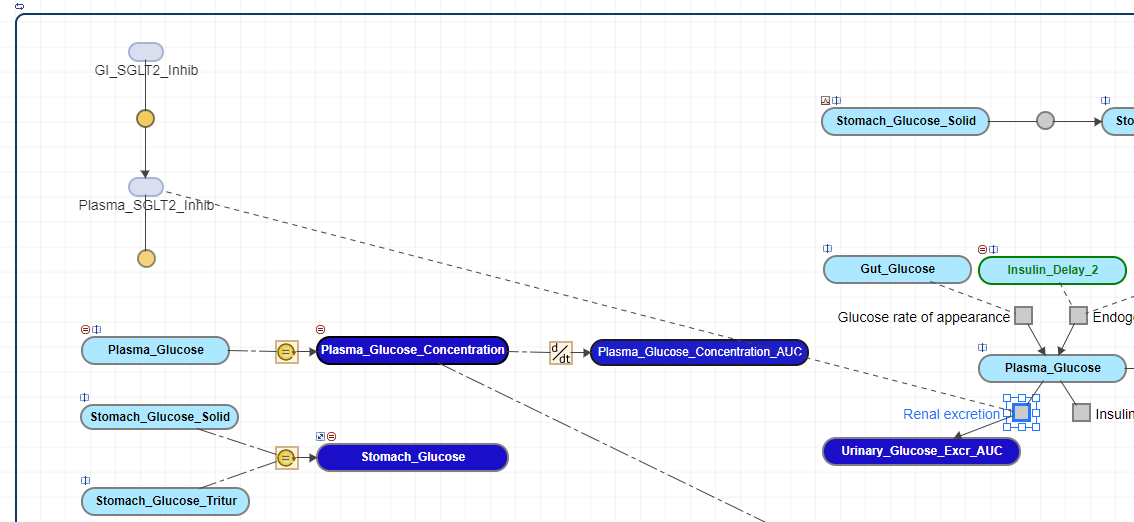 В следующих шагах вы обновите реакцию почечной экскреции до Plasma_Glucose + Plasma_SGLT2_Inhib -> Plasma_SGLT2_Inhib + Urinary_Glucose_Excr_AUC, где соединение-ингибитор Plasma_SGLT2_Inhib является как реагентом, так и продуктом реакции.