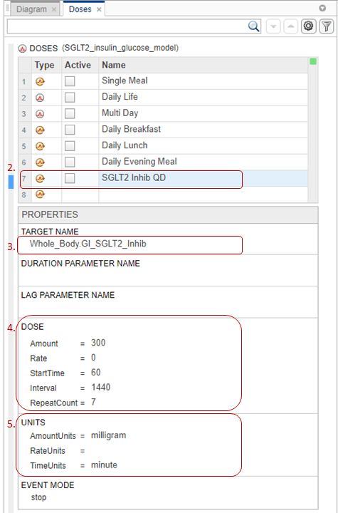 SimBiology позволяет моделировать увеличение количества вида за счет стимула, такого как пероральное или внутривенное введение препарата. Для моделирования такого увеличения видового количества используйте компонент моделирования дозы. На следующих шагах вы моделируете потребление препарата-ингибитора, например, один раз в день в течение x дней, путем дозирования GI_SGLT2_inhib виды.