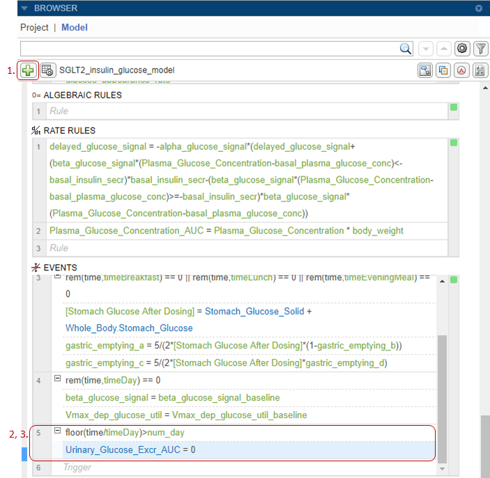 В следующей строке EventFcn введите Urinary_Glucose_Excr_AUC = 0.