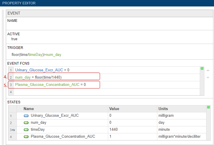 Чтобы добавить вторую функцию события к тому же событию, перейдите на панель редактора свойств события. В таблице Event Fcns дважды щелкните пустую строку и введите следующее для сброса количества дней: num_day = floor(time/1440).
