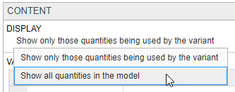 По умолчанию в разделе Содержимое отображаются только те количества, которые изменяются вариантом. Для просмотра всех величин модели выберите Show all quantities in the model в разделе «Отображение».