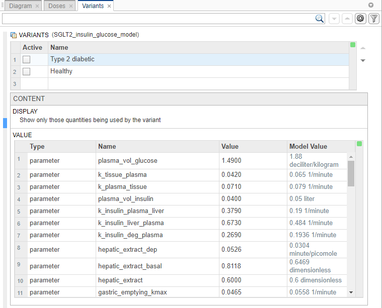 Биологическую изменчивость можно моделировать с помощью компонента моделирования, называемого вариантом. Вариант - это набор количеств с альтернативными значениями. Например, в этом примере можно иметь набор значений параметров для пациента с диабетом 2 типа и другой набор значений для пациента без диабета 2 типа.