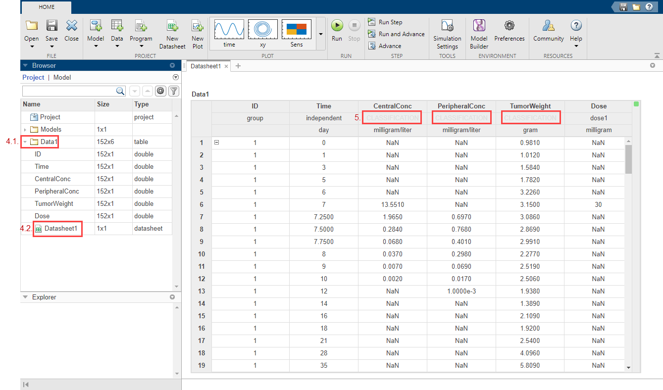 Классифицируйте измеренные отклики данных как зависимые переменные. На панели «Обозреватель» разверните папку «Data1» и дважды щелкните «Datasheet1».