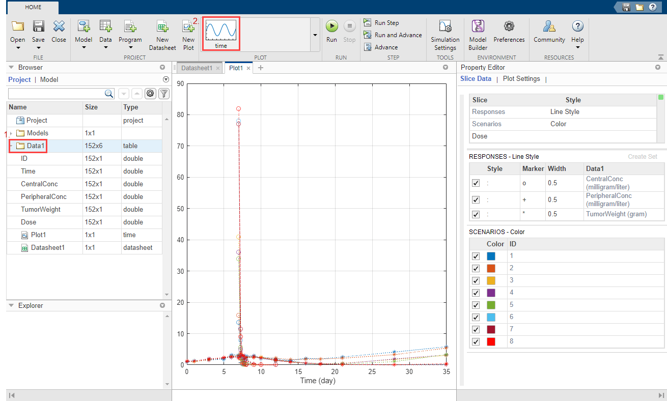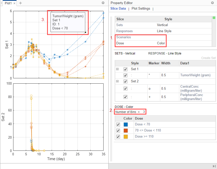 Данные среза можно разделить с помощью различных переменных среза. Каждая переменная среза отображается на графике с различным визуальным стилем (или каналом), таким как цвет, стиль линий и положение осей. Переменные среза могут представлять атрибуты данных, такие как ответы или сценарии (т.е. группы или прогоны моделирования). Разделяющие переменные также могут быть ковариатами или значениями параметров, связанными со сценарием или группой. По умолчанию приложение предоставляет разделенные переменные для различных переменных ответа и различных сценариев в построенных данных. Можно добавить другие визуальные стили (или каналы) для наборов ответов и связанных переменных параметров или ковариат.