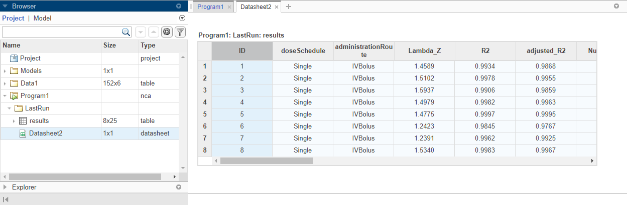 По умолчанию результаты сохраняются в папке LastRun программы. Чтобы получить доступ к результатам, на панели «Обозреватель» разверните папку Program1. Затем разверните папку LastRun. Результаты NCA сохраняются в таблице с именем results. Дополнительные сведения о вычисленных параметрах NCA см. в разделе Некомпартментальный анализ.