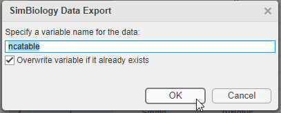 Откроется диалоговое окно Экспорт данных SimBiology. Измените имя переменной на ncatable. Нажмите кнопку ОК.