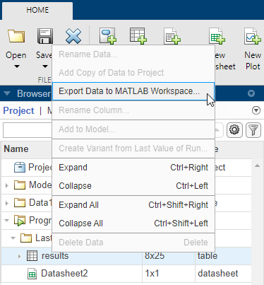 Щелкните правой кнопкой мыши результаты. Выберите Экспорт данных в рабочую область MATLAB (Export Data to MATLAB Workspace).