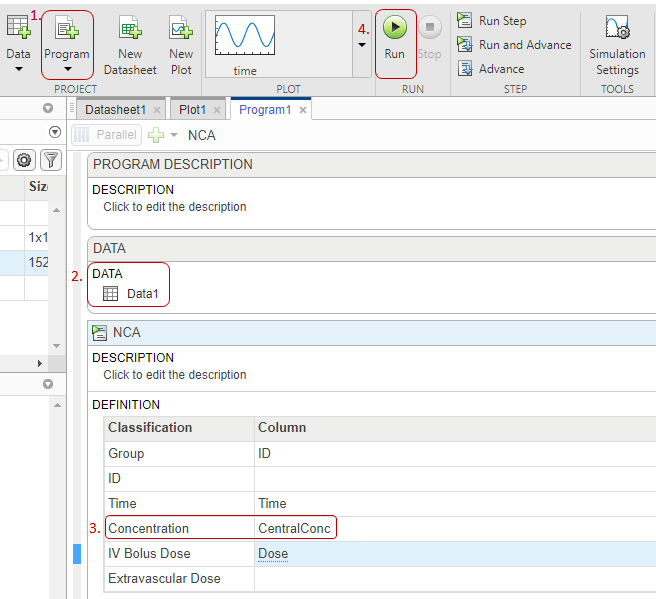 На шаге настройки данных программы определяется набор данных, используемый для анализа NCA. В этом примере программа автоматически выбирает Data1.