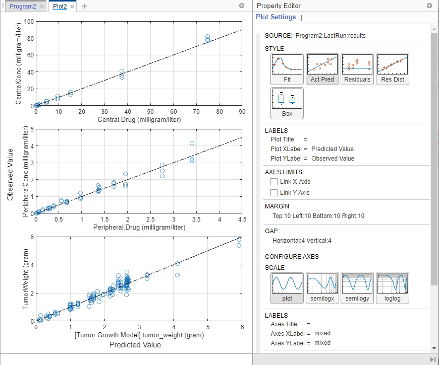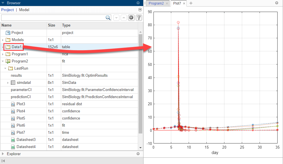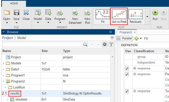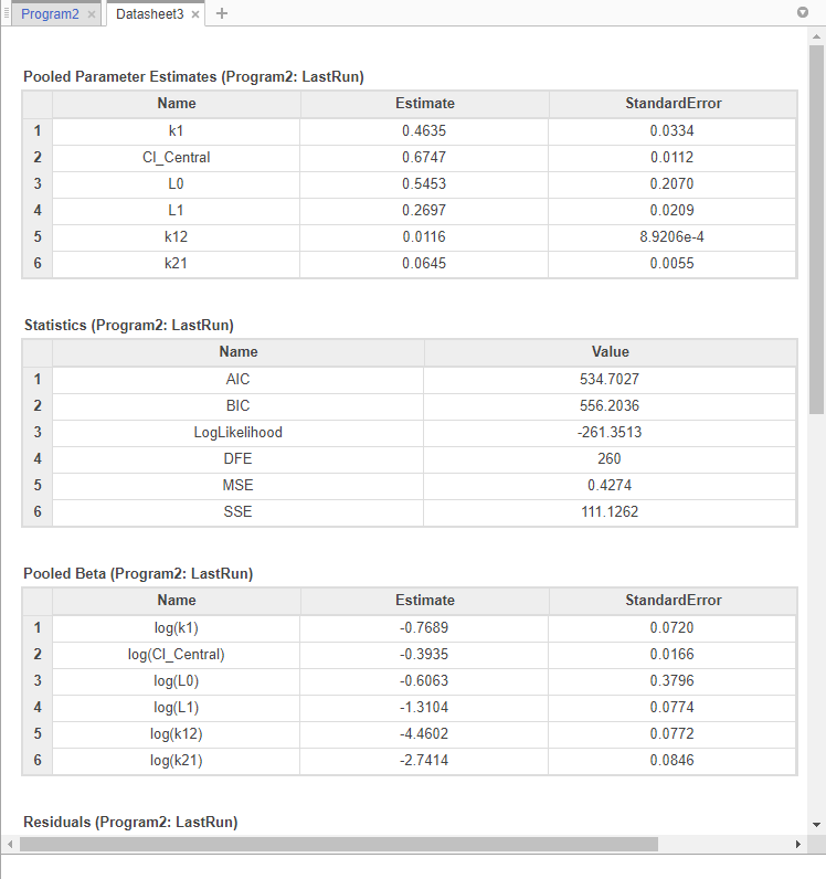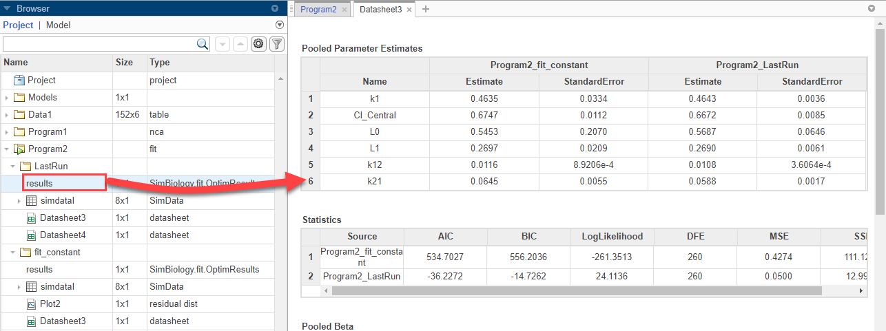 На панели «Обозреватель» разверните узел «Program2» > «LastRun», содержащий результаты и simdableI. результаты содержат оценочные значения параметров и статистику подгонки. simdateI содержит смоделированные отклики модели для каждого человека (пациента или группы), используя оцененные значения параметров.