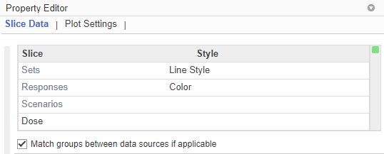 Таблица «Фрагмент» (верхняя таблица в редакторе свойств) теперь содержит наборы. Эта таблица представляет собой сводную таблицу всех переменных среза, которые в настоящее время присутствуют на графике, и соответствующих стилей печати. На этом текущем графике разделяющими переменными являются «Наборы», «Ответы», «Сценарии» и «Доза».