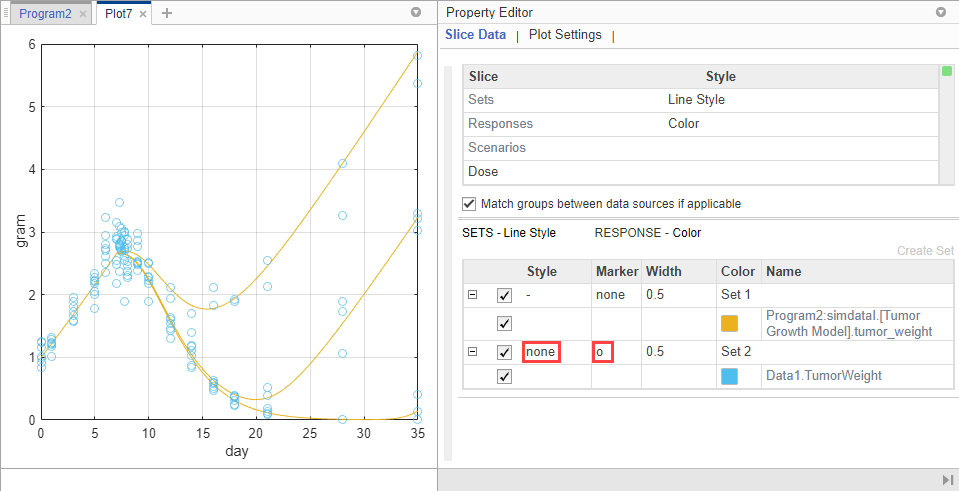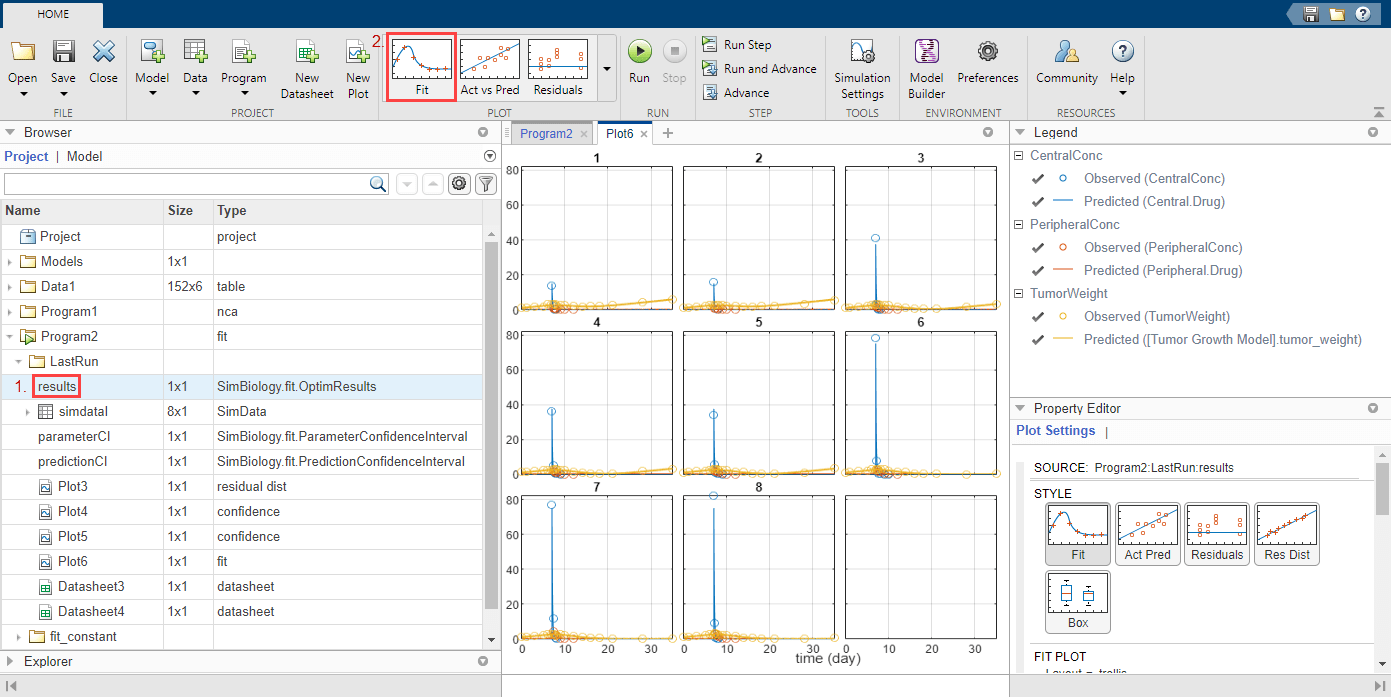 На вкладке Главная выберите Программа > Подогнать данные . На новой вкладке появится новая программа (Program2). Этапы данных и модели были предварительно заполнены Data1 и моделью роста опухоли соответственно.