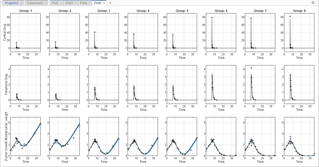 Экспериментальные (синтетические) данные содержат измерения от восьми пациентов для трех ответов: измеренных концентраций лекарств в центральном отделении, в периферическом отделении и измеренной массы опухоли. Данные также содержат информацию о дозировке, и каждый пациент получает внутривенную дозу на 7 день.