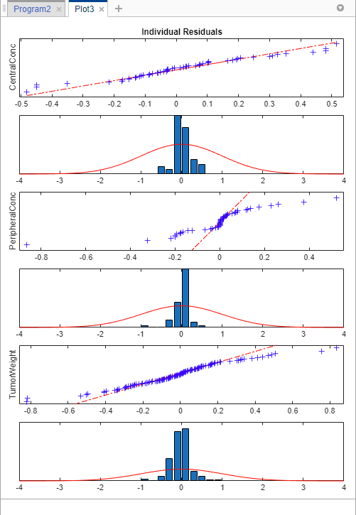 График показывает, распределены ли обычно остатки для каждого ответа. В графике идеальной нормальной вероятности остатков остатки выстраиваются вдоль диагональной линии по графику, а гистограммы указывают нормальную посадку. Однако из сюжета остатки для всех трёх откликов, особенно CentralConc и DepartingConc, как представляется, обычно не распределяются. Это может указывать на то, что предположение о модели постоянной ошибки неверно.